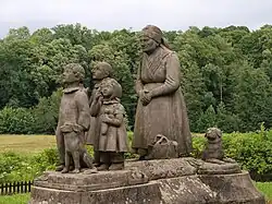 If we walk upstream of the mill drive we find ourselves – after covering a little less than one hundred metres – standing by one of the symbols of Ratibořice. It is a monument called Grandmother and Her Grandchildren. Its foundation stone was laid in July 1920 on the occasion of the hundredth anniversary of the birth of the writer Božena Němcová. The solemn unveiling of the monument took place on 9 July 1922 and was widely attended by societies, corporations and prominent persons from the whole republic. The group of statues was realized in sandstone by the sculptor Otto Gutfreund after his own design in whose case he cooperated with the architect Professor Pavel Janák.