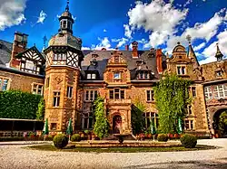 After taking over ownership, Stumm commenced construction activity on the estate by demolishing the old moated castle, the adjacent farm and the tithe barn.[4] On the hill behind it, Stumm built a new manor house, called Rauischholzhausen Castle, and nearby farm yard. Architect Carl Schäfer was commissioned to design the castle in the style of Klein-Potsdam,[5] and the park was designed by Heinrich Siesmayer, the creator of the Frankfurt Palmengarten.[6][7] Construction took place between 1871 and 1878, however, the building collapsed in 1873, because of poor foundation work. Carl Jonas Mylius and Alfred Friedrich Bluntschli (students of Gottfried Semper), were hired to redesign the castle in line with Schaefer's original designs. Construction of the roof and the south-east wing was completed in 1875 and the main building was completed a year later with the half-timbered section of the building completed in 1878.[8]