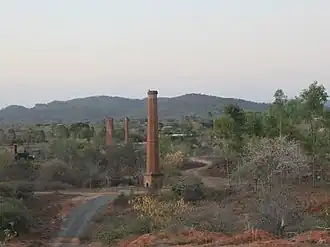 The Ravenswood Gold Mining Syndicate's (Judge's) mill initially consisted of 10 head of stamps obtained from the Mother Lode Mill at Mount Wright (northwest of Ravenswood), powered by a diesel engine. The ore was crushed by the stamper battery, concentrated with Wilfley tables, and then either treated with cyanide or sent to the Chillagoe smelters. Initial success with some rich ore led to enlargement of the mill to 30 stamps in 1939–1940.[14][147] The annual report for 1940 claimed the mill had been expanded to 30 head of stamps during 1940, but work was reportedly also underway on the expansion in late 1939.[148] A Stirling boiler and a 250 hp engine were also obtained from the Burdekin meatworks (Sellheim), and a rock breaker, elevator and conveyor were installed.[149] However, the upgraded mill proved to be overpowered and required a lot of timber fuel; the brick foundations used for the machinery were not strong enough; and the best ore from the Sunset had already been treated, so the mill closed early in 1942 and the plant was moved to Cloncurry.[1][29][150][151]