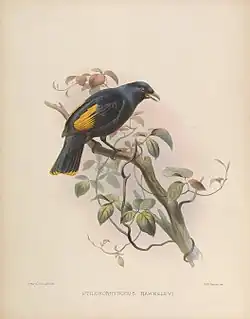 It is based on a unique specimen collected by Henry Charles Rawnsley at Witton, near Brisbane in Queensland, Australia, on 14 July 1867. It was described and illustrated (as Ptilonorhynchus rawnsleyi) in the same year by Silvester Diggles in Part 15 of his three-volume work The Ornithology of Australia.[2] It had at various times been considered to be a valid bowerbird species, an aberrant individual of the satin bowerbird, or an adult hybrid individual resulting from the natural crossing of a regent bowerbird with a satin bowerbird.[3][4] The specimen was lost prior to 1950.