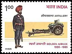 Commemorative stamps have been released were released by India Post depicting field artillery, a gunner and howitzer from Mountain Battery on the Golden Jubilee of the Regiment of Artillery and on the 50th anniversary of the 9 (Parachute) Field Regiment.[21][22][23]