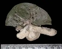 Photo of liver and pancreas showing multiple cysts in the latter in a patient with renal–hepatic–pancreatic dysplasia