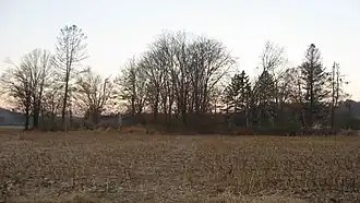 The central part of the district is the Rennert Mound (also known as the "Minnie Rennert Mound"),[1] which retains its original shape despite digging by locals in the past. Because the mound has never been excavated professionally, no significant artifacts have been recovered from it; consequently, the culture of the builders is unknown.[3] The surrounding field has yielded plentiful lithic cores of white and tan chert, but too few cores have been found to justify classification of the fields as a village site.[4]: 120  Due to its location and shape, the mound is believed to have been built by Adenan or Hopewellian peoples, both of which typically buried many bodies and large numbers of grave goods within mounds of this size.[3] Another mound was once located approximately 90 feet (27 m) to the west, but it has been destroyed. The preservation of the one mound despite the destruction of the other is likely due to recent intervention: in the early twentieth century, landowner John Rennert planted trees all around this mound to preserve it, but he made no such efforts around the other mounds.[4]: 120