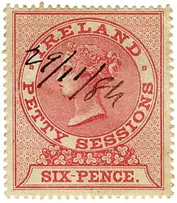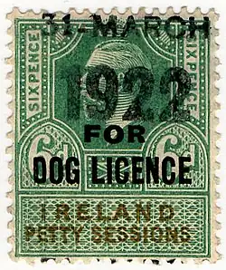 British Admiralty Court, Chancery Court and Judicature stamps were also overprinted for use in Ireland. In addition, specific designs depicting Queen Victoria were also used for Admiralty Court, Chancery Fee Fund, Petty Sessions, Record of Titles and Registration of Deeds. Dog licence stamps depicting an Irish Wolfhound were introduced in 1865 and remained in use until partition.[1]