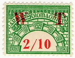 Following partition, the following George V key types were issued for Southern Ireland in 1921–22: Civil Service, Companies Registration, Contract Note, County Courts, Estate Duty, Foreign Bill, Judicature, Land Registry, Official Arbitration and Petty Sessions.[1] At this point, revenue stamps of Northern Ireland were also introduced, and these continued to be issued until the late 20th century.[2]