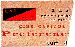 Collectivization in the countryside generally began with the establishment of CNT-FAI committees. These committees collectivized the soil of the rich and in some cases the soil of the poor as well. Farm buildings, machinery, transport and livestock were also collectivized. Food reserves and other amenities were stored in a communal depot under committee control.[24] In many localities, the local committee issued its own inconvertible paper money; wages were paid with this money, the size of which was determined by the size of the family. Locally produced goods were free if abundant, or bought at the communal storage. State issued convertible money was only used in trade with regions that had not adopted this system, and trade with other anarchist regions was done by barter.[25] Since the committee controlled all the money supply, travel to another region required getting permission and convertible money from the committee.