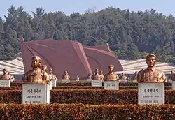 The entrance to the cemetery is marked by a monumental gate in Korean style. Each of the graves is provided with a bronze bust. At the far end of the memorial there is a conspicuous red flag made of granite.[2] Heo-nik Kwon and Byung-Ho Chung (2012) covered the cemetery in their publication North Korea: Beyond Charismatic Politics, noting the cemetery's significance in politics, where it can not only satisfy the North Korean need for revolutionary narratives, but also compensate for its large-scale absence of ordinary military cemeteries.[3]