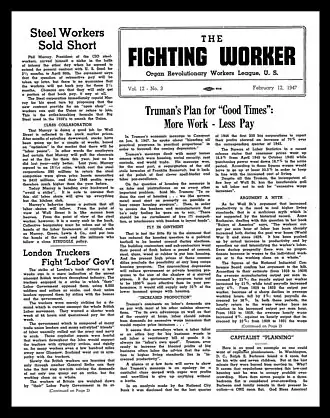 The Revolutionary Workers League was active inside a number of trade unions, particularly the United Auto Workers. They succeeded in having one of their members Zygmount "Ziggy" Dobrycinski elected as head of Local 205. However, when the RWL began to make demands for the "politicalization" of the members, including a six-hour day and workers management of the industry, "Ziggy" quit the RWL.[10]