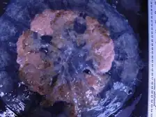 The diameter of Rhopilema verrilli ranges from 35 to 50 cm; the maximum size found is 51 cm in bell diameter. The bell is gelatinous, mushroom-shaped, and translucent. The bell ranges from a variety of colors such as white to light yellow, brown, blue, pink or green. The margins of the bell usually have a very light-brown pigmentation. Laterally, the species has a reddish-brown pigmentation from the organs underneath such as the pinkish digestive glands. The mushroom jellyfish lack tentacles; instead, they have 8 oral arms with finger-shaped appendages with nematocyst warts underneath the middle of the umbrella. The arms are brownish in color.[3] The species has 8 rhopalia, which are small pink structures located around the bell margin. Each rhopalium contains a gravity sensor, allowing the jellyfish to tell its orientation and direction. This jellyfish also has 8 radial canals. The radial canals along with the stomach form the gastroendodermal system.[7]