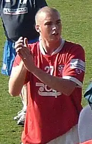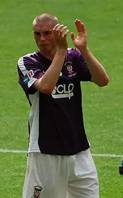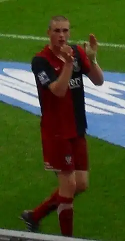 Brodie was named as York's Players' Player of the Year for the season, as well as being awarded the Keith Walwyn Golden Boot, having scored 32 goals at that point.[99] York finished fifth in the Conference Premier,[100] and Brodie was the division's joint top scorer alongside Matt Tubbs with 26 goals.[76][101] He scored the winning goal on 89 minutes to give York a 1–0 home victory against Luton in the play-off semi-final first leg.[102] He played in the 1–0 away victory in the second leg, meaning York won the tie 2–0 on aggregate.[103] After the match, Brodie was hit by a coin, with the squad being forced into the back of a stand after missiles were thrown at them by a section of Luton fans.[104] He started in the 2010 Conference Premier play-off final at Wembley Stadium on 16 May 2010, in which York lost 3–1 to Oxford.[105] He finished 2009–10 with 51 appearances and 34 goals,[76] making him York's highest goalscorer in a season since Bottom scored 39 in 1954–55.[106] York entered negotiations over a new contract with Brodie after the end of the season.[107] At the Football Conference's Annual Presentation Dinner, he was named the Conference Premier Player of the Year and a member of the Team of the Year.[108]