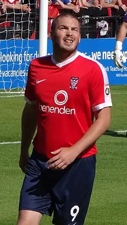 Brodie re-signed for York City, who were newly relegated into the National League, on 17 May 2016 on a one-year contract.[155] He made his second debut for York as an 84th-minute substitute in a 1–1 away draw with Maidstone United.[156] Having struggled to come to terms with the physical requirements of returning to professional football, Brodie was told by manager Jackie McNamara that he would not start home matches until improving his fitness levels.[157] Brodie scored his first goal of 2016–17 with a penalty in first-half stoppage time away against Gateshead on 16 August 2016, with York losing 6–1.[131][158] This marked the start of a run of five goals from five matches, with McNamara praising his ability to score different types of goals, having scored with a header, a penalty, a left-footed volley and two right-footed shots in this run.[159] Despite being York's top scorer with seven goals, new manager Gary Mills suggested in November 2016 that Brodie was not fit enough to play under him.[160]