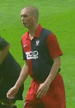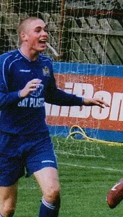 Brodie scored the winning goal for York in a 2–1 away victory over Oxford United in the FA Trophy second round, ensuring their progression to the third round.[46] He scored York's first goal in a 2–1 home win over AFC Telford United in the FA Trophy semi-final second leg, with the tie being won 4–1 on aggregate, which saw the team reach the final at Wembley Stadium.[67] A yellow card picked up against Kidderminster Harriers on 28 March 2009 resulted in Brodie receiving a two-match suspension, meaning he would miss matches against Grays and Oxford, after being booked on 10 occasions during the season.[68] He returned to the team for a 2–1 home defeat to Northwich on 11 April 2009, and during this match he was fouled in the penalty area, with the penalty kick being scored by Mark Robinson.[69] Brodie scored against Weymouth in a 2–1 away victory on 24 April 2009, which ensured York's survival in the Conference Premier.[70] They finished the season 17th in the table.[71] Brodie started in the 2009 FA Trophy Final at Wembley Stadium on 9 May 2009, which York lost 2–0 to Stevenage Borough.[72] He finished the season as York's top scorer with 19 goals in 46 appearances,[46] and in May 2009 the club exercised its option to extend his contract for 2009–10.[73]