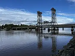 On its journey it passes through the towns of Kyogle, Casino, Coraki and Woodburn. Summerland Way is situated adjacent to much of the middle reaches of the course of Richmond River. The Pacific Highway crosses the river near Broadwater. The lowest permanent vehicular crossing (closest to the river mouth) is the lift-section bridge at Wardell, while closer to Ballina, the Burns Point Ferry provides an additional manually operated, daytime vehicle and passenger crossing service, operating between the shores of South and West Ballina. Upstream from Wardell, the next regular (non motorway) road crossings are provided by road bridges at Broadwater (Broadwater Bridge) and Woodburn.