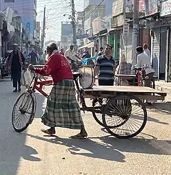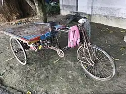 A rickshaw van (Bengali: রিকশা ভ্যান) or van-gari (Bengali: ভ্যান গাড়ি) is a three-wheeled bicycle with a large wooden platform on the back part, used primarily to transport people and goods.[1][2] It is a common mode of transportation in Bangladesh and India, popular because of its cheap price.[3] Furthermore, it does not require fossil fuels or cause air pollution.[4]