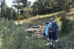 The Juniper Trail is a rocky, dirt loop trail that offers visitors a choice between a 2.25-mile (3.6 km) hike that takes about an hour to complete and a 0.25-mile (0.4 km) walk that takes about 15 minutes.[22] It is suitable for running as well as hiking and walking.[5] It passes over rolling hills through scattered trees and desert shrubland, rising 190 feet (58 m) to rocky bluffs where an overlook provides a scenic view of the Mora River and the Sangre De Cristo Mountains in the distance.[5]