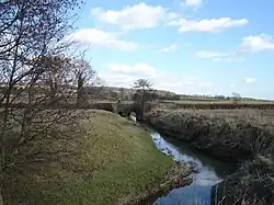 Just before the next bridge is Beckley Furnace Farm. Between 1578 and 1770, this was the site of an iron works, which produced cannons for the Royal Navy. The bellows for the charcoal furnaces were water-powered, but the works was unable to compete with furnaces located near to coalfields, which used coke for fuel.[13] After the demise of the furnace, a watermill was built on the site, and lasted until 15 April 1909, when it was destroyed in a fire.[14] The river continues to the south east to reach Hundredhouse Bridge on Hundredhouse Lane. By the time it passes Billingham Wood, it is below the 16-foot (5 m) contour. The valley floor now opens out, and is crossed by numerous drainage ditches. The course turns briefly to the north east, and passes a series of lakes near Marley Farm, once the upper limit of navigation.[9] It then forms a large loop, on which a westerly extension to Rye was built after the Second World War.[15] As it enters Rye, it passes under Ferry Road and a bridge carrying the Marshlink railway line. There is a grade II listed smock mill beside the bridge, which dates from the 1930s. The original mill on the site was destroyed by fire in 1930, and under the terms of its lease, it had to be rebuilt.[16] Tillingham Sluice is located just before the final bridge, which carries the A259 Winchelsea Road over the channel, and below it is Strand Wharf. The river then joins the River Brede, and both pass through the Rock Channel, to reach the River Rother, and the outlet to the sea.[9]
