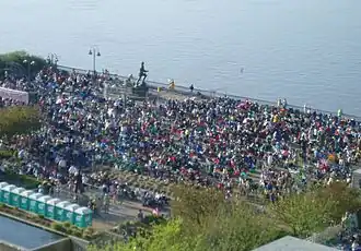 Riverfront Plaza/Belvedere is a public area on the Ohio River in Downtown Louisville, Kentucky. Although proposed as early as 1930, the project did not get off the ground until $13.5 million in funding was secured in 1969 to revitalize the downtown area (through which Interstate 64 had just been built). On April 27, 1973, the Riverfront Plaza/Belvedere was dedicated. Running between Third and Sixth streets, it consisted of a large parking garage and the interstate, and a grassy 7-acre (28,000 m2) park built atop. The grassy park section on the western end was the Belvedere, and the Riverfront Plaza to the east included other attractions: fountains, shelters and an ice-skating rink, as well as buildings such as the Galt House, One Riverfront Plaza and the American Life Building.