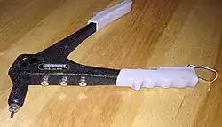 Pop rivet gun with rivet inserted