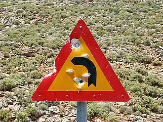 The first road signage on Greek roads with contemporary signs was made in 1924 by ELPA (Elliniki Leschi Periigiseon kai Aftokinitou, lit. translated: Hellenic Club of Tours and Car),[5] which took over the road network's signage until 1957, when it was taken over by the state.[6] The signs were subject to the provisions of the Geneva Protocol on Road Signs and Signals.
