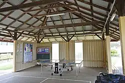 In 1899 the playshed was built. The Queensland education system recognised the importance of play in the school curriculum and, as school sites were typically cleared of all vegetation, the provision of all-weather outdoor space was needed. Playsheds were designed as free-standing shelters, with fixed timber seating between posts and earth or decomposed granite floors that provided covered play space and doubled as teaching space when required. These structures were timber-framed and generally open sided, although some were partially enclosed with timber boards or corrugated galvanised iron sheets.[30] The hipped (or less frequently, gabled) roofs were clad with timber shingles or corrugated iron. Playsheds were a typical addition to state schools across Queensland between c. 1880s and the 1950s, although less frequently constructed after c. 1909, with the introduction of highset school buildings with understorey play areas. Built to standard designs, playsheds ranged in size relative to student numbers.[31] In 1948 the Roadvale State School playshed was partially enclosed with iron sheeting which had come from the recently closed Obum Obum State School's playshed, and in 1956 the playshed floor was concreted.[23][32][1]