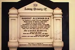 A memorial to Allwood on the wall of St James' Church, Sydney