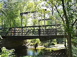 A Protestant church and cemetery, was founded in 1846. A wooden bridge was built over Buffalo Creek in the late 1800s to connect a commerce district with the Protestant church.[4] By the end of the nineteenth century, the expansion of the crossroads on the other side (becoming home to multiple businesses and a town hall) and the rise of the automobile introduced the need for a new, sturdier bridge. In response, the bridge that exists today was built in 1906 by the Joliet Bridge and Iron Company,[2]: 7,8 [4] and it became known as the Buffalo Creek Bridge.[8]