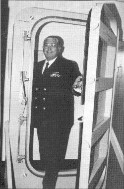 Rear Adm. Robert T. Reimann demonstrates a prototype gasket for shipboard hatches in 1991.