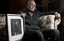 ![]() Robert Hyndman in 2009 with a photograph of himself during the Second World War. The wartime portrait is by Yousuf Karsh | |