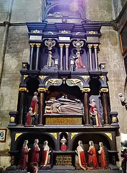 The Boyle Family Monument at the West End of St Patrick's Cathedral, Dublin, erected in 1632 by Richard Boyle, 1st Earl of Cork for himself, his wife, Catherine and family. In the top tier is the recumbent figure of his wife's grandfather, Robert Weston.[7]
