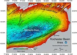 The Rochester Basin, at 802 feet (244 m), is the deepest part of Lake Ontario.[1] The lake bottom of the Rochester Basin is strongly marked by glaciation, with parallel gouges and underwater drumlins.[2][3]