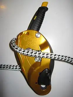 Self-locking devices (SLDs), also called progress capture devices (PCDs), are the terms given to the broader class of rope devices that allow the climbing rope to move more freely in one direction but will lock quickly if the rope tries to move in the opposite direction. Their basic action means that several can also be used as emergency ascenders or assisted-belaying devices (ABDs), but they come in a broad range for a variety of uses (e.g. as a hauling or rescue pulley, like the Petzl Traxion).[23]