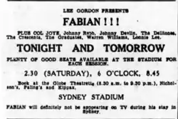 - ^ "FABIAN FLEES FROM AUSSIES ON TRUCK LIFT". Chicago Daily Tribune. 19 October 1959. p. b12.
