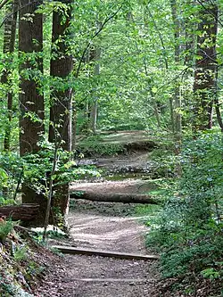 The Rock Creek Park Act authorized the purchase of no more than 2,000 acres (810 ha) of land, extending north from Klingle Ford Bridge in the District of Columbia (approximately the northern limit of the National Zoo), to be "perpetually dedicated and set apart as a public park or pleasure ground for the benefit and enjoyment of the people of the United States".[8] The Act also called for regulations to "provide for the preservation from injury or spoliation of all timber, animals, or curiosities within said park, and their retention in their natural condition, as nearly as possible".[9] Rock Creek Park is the oldest natural urban park in the National Park System.[10] Park construction began in 1897.[5]