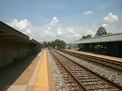 Rockville station is located on an embankment south of Park Road and east of Hungerford Drive and downtown Rockville. The two tracks of Metro's Red Line are served by a single island platform. Just to the east are the two tracks of the CSX Metropolitan Subdivision, flanked by two low-level side platforms used by Amtrak and MARC.[1] A pedestrian underpass provides access to the platforms from parking lots, bus bays, and kiss-and-ride lots on the east and west sides of the station. A footbridge over Hungerford Drive connects the west side of the station to the Montgomery County office buildings and Rockville Town Center.[1]