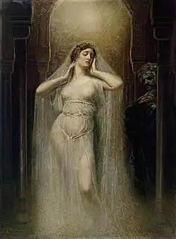 He remained in Paris until 1914, when World War I forced him to return to Spain. He died in Madrid the following year. From 2013 to 2014, in celebration of Wagner's 200th birthday, the Museo del Prado presented an exhibition of Egusquiza's works called "El Mal se desvanece" (Evil fades), which included several portraits of classical literary figures as well as his Wagnerian works.[2]