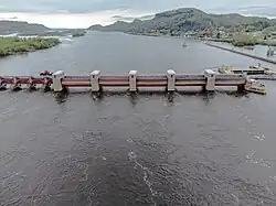 A roller dam is a type of hydro-control device specially designed to mitigate erosion. They are most often used to divert water for irrigation but the largest and most notable examples are used to ease river navigation. The world's first roller dam (German: walzenwehr) was constructed in Schweinfurt, Germany in 1902 to divert irrigation water south of the Main river.[1][2]