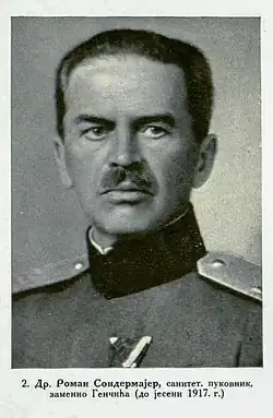 Colonel Dr. Roman Sondermajer CMG (Serbian: Роман Сондермајер) (28 February 1861– 30 January 1923) was a Royal Serbian Army physician who served as Chief Surgeon of the Royal Serbian Army, Chief Surgeon and Director of the Military Hospital and Chief of the Medical Staff of the Serbian Supreme Command during World War I.