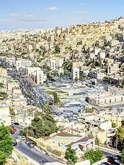 Between the third century BC and seventh century AD, Amman was called Philadelphia.[1] Following the Roman conquest of the Near East in 63 BC, Philadelphia became part of the regional ten-city league known as the Decapolis.[1] In AD 106, Philadelphia was incorporated into the Roman province of Arabia Petraea, and became an important stop along the Via Traiana Nova, 'Trajan's New Road'.[1] Thus, the city prospered in the second century AD, with many Roman landmarks constructed during that time, including a large theater, a small odeon theater, and a forum in the Amman valley, near a water stream known in Arabic as Seil.[1] A stairway connected the valley to the upper part of the city, the acropolis, located on the hill to the north, which is known today as Jabal Qal'a (Citadel Hill), where the Roman Great Temple was built, better but inaccurately known as the Temple of Hercules.[1] The Roman baths were uncovered in the valley near the course of the historic Seil (which had been roofed over to make way for roads in the 1960s), namely beneath today's Al-Hashemi street.[1]