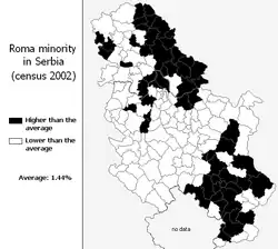 Romani people, or Roma, are a recognized ethnic minority in Serbia.[2] According to data from the 2022 census, they are the fourth largest ethnic group in the country, numbering 131,936 and constituting 2% of the total population.[1] However, owing to various factors, the census figure likely underrepresents the actual population.[3][4]