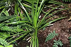 It is a small, hard-leaved lily-like plant that forms in tufts or in clumps, atop stilt-like roots. Its foliage grows up to approximately 15 cm (5.9 in) tall and has long, narrow leaves that are 6 to 12 cm (2.4 to 4.7 in) long and only 3–4 mm (0.12–0.16 in) wide. Its flower stalks are up to approximately 20 cm (7.9 in) tall, carrying clusters of the white flowers, their petals and sepals similar in appearance and 3–4 mm (0.12–0.16 in) long.[4]