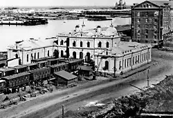 In 1896 the All-Russian Exhibition was held in Nizhny Novgorod. After the exhibition, a branch of the Technical Society was established in the city, which began to address the issue of connecting the city by rail. The company developed a project for the Nizhny Novgorod - Kazan railway. In order not to build a bridge across the Oka, it was decided to run the railroad tracks along the coastal terrace. The location for the station was chosen on the right bank of the Oka, near the pier of the Bashkirov flour mills. Also, the station was located across the Oka opposite the already existing Moskovsky railway station. The construction started in 1900 was completed in 1904. The construction was carried out by the Society of the Moscow-Kazan Railway. The construction was supervised by Grigory Budagov.[1] The view of the railway station was captured by the photographer of the Russian Empire, Maxim Dmitriev.