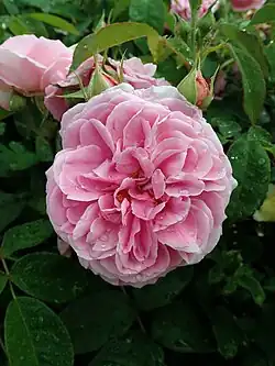 'Gertrude Jekyl' is a tall bushy shrub rose, 6 to 9 ft (1.8–2.7 m) in height, with a 3 to 4 ft (0.91–1.22 m) spread.[1] It has a fully double, quartered bloom form and a strong, old rose fragrance. The flowers are large, 4 to 5 in (100–130 mm), and are bright pink with a light red center, fading to pale pink at the edges. They are borne in small clusters of 3–5. The plant has long, pointed, dark green foliage and prickles. 'Gertrude Jekyll' is a vigorous grower and a repeat bloomer during the season. It can reach 9 ft (2.7 m) in height in hot climates and can be grown as a short climber. [2][3]