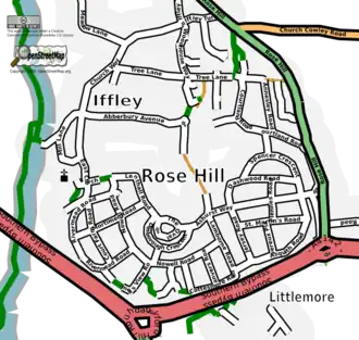 The residential estate of Rose Hill is largely to the west of the road of the same name. The road is part of a historic route from Oxford to London via Henley, running parallel to the river Isis (the name of the Thames in Oxford). The centre of Rose Hill estate is the Oval, a large expanse of grass in the centre of a turning circle. On the Oval is Rose Hill Primary School (formerly Rose Hill First). Adjacent to the Primary School is the Rose Hill Community Centre, formally opened in 2016 costing £5 million.[2] A focal point of the road of Rose Hill is a small landscaped triangle adjacent to a row of shops built in the 1940s that have a part-timbered Tudor style facade.