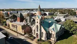 In 1867, the center portion of the present sanctuary was built. Designed by Frank F. Ward of Ward & Davis,[3] It was enlarged with wings on either side in 1875. After using the original frame building as a Sunday school house, it was removed and the present red brick building, known as the "Education building" was erected.