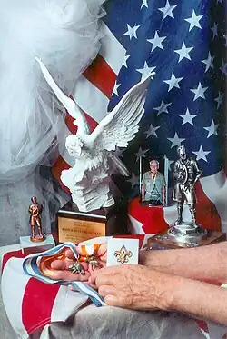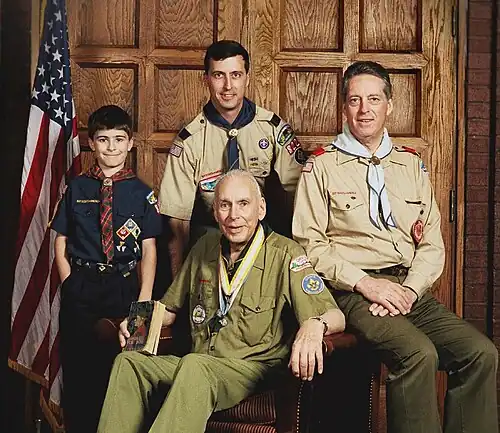 Ross received the Ore-Ida Council distinguished service Silver Beaver Award in 1956 and the BSA Regional distinguished service Silver Antelope Award in 1991. In 1992 he was awarded the first Hall of Fame Award for the Ore-Ida Council. All four of Ross and Margie's sons are scouts and at the time of his death he counted 35 Eagle Scouts in his posterity - but by January 2012 that number had risen to 42.[5] The Butler family spent many summers at BSA's Camp Billy Rice at Warm Lake, Idaho.