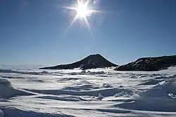 Ross Island is an island in Antarctica lying on the east side of McMurdo Sound and extending 43 nautical miles (80 km; 49 mi) from Cape Bird in the north to Cape Armitage in the south, and a similar distance from Cape Royds in the west to Cape Crozier in the east. The island is entirely volcanic. Mount Erebus, 3,795 metres (12,451 ft), near the center, is an active volcano. Mount Terror, 3,230 metres (10,600 ft) about 20 nautical miles (37 km; 23 mi) eastward, is an extinct volcano. Mount Bird rises to 1,765 metres (5,791 ft) just south of Cape Bird.[1]