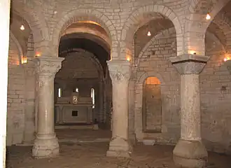 The upper matronaeum has also eight columns which creates a circular ambulatory facing the central hollow of the lower section. It has also a small apse with traces of frescoes. The capitals on both floors, and the portal, have well sculpted zoomorphic, human and geometric figures.