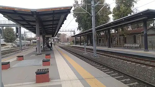 Rouf railway station (Greek: Σιδηροδρομικός Σταθμός Ρουφ, romanized: Sidirodromikos stathmos Rouf) is a station on the Piraeus–Platy railway line in Rouf, a neighbourhood of Athens, located on the borders of the municipalities of Athens and Tavros. Originally opened on 30 June 1884 it was rebuilt to serve Athens Suburban Railway lines when this section came into operation in June 2007.[4] It owes its name to the area of Rouf, named after a Bavarian businessman who once owned the land in the 19th century.