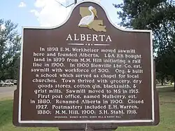 From 1898 to 1927, the Alberta community thrived just north of Roy. Alberta began when E. M. Werkheiser established a sawmill, and the Louisiana and Arkansas Railway came into the area. By 1900, some three hundred were employed at a sawmill of the Bienville Lumber Company, which built a school, which also served as a chapel for area churches. There was a grocery store, dry goods store, cotton gin, blacksmith shop, and several gristmills. In 1915, the sawmill was moved to Mississippi. A post office operated at Alberta until 1927[3]