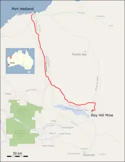 - ^ "ROY HILL INFRASTRUCTURE RAILWAY, SHIRE OF ASHBURTON, SHIRE OF EAST PILBARA, TOWN OF PORT HEDLAND – PROPOSAL UNDER S46 OF THE ENVIRONMENTAL PROTECTION ACT 1986 TO AMEND CONDITION 5-1 OF MINISTERIAL STATEMENT 847" (PDF). www.epa.wa.gov.au. Environmental Protection Authority of Western Australia. May 2011. Retrieved 26 March 2022.